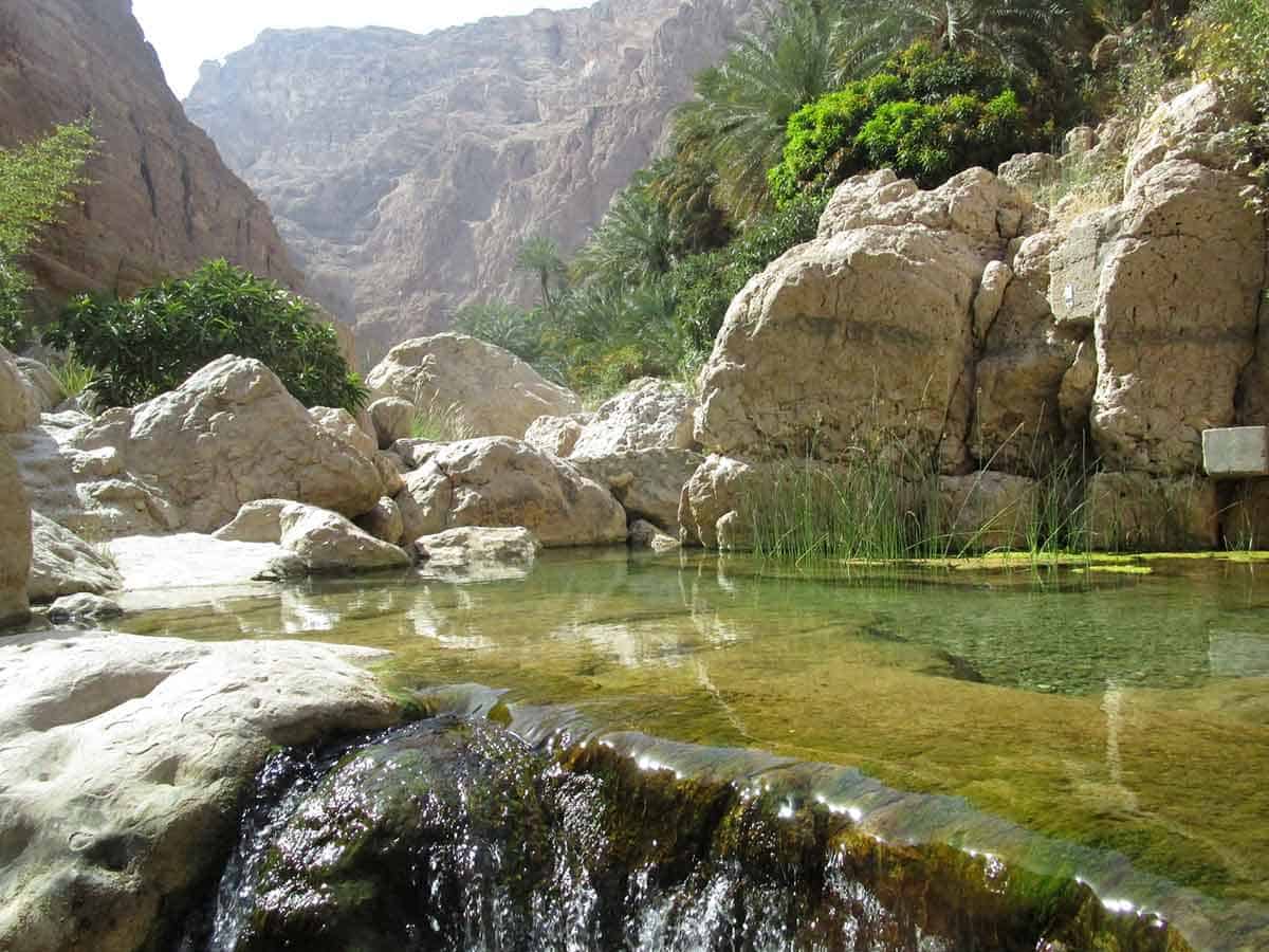 Scenic view of Wadi Shab in Oman, showing clear turquoise water flowing gently between large rocky cliffs. Green vegetation and palm trees grow along the edges of the stream, surrounded by rugged desert mountains under bright sunlight.
