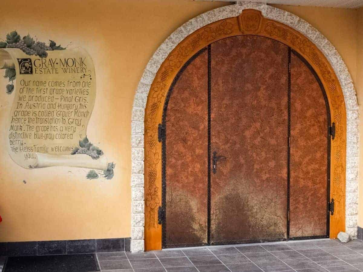 Famous arched wooden doorway at Gray Monk Estate Winery with grapevine carvings and a mural explaining the winery’s name.