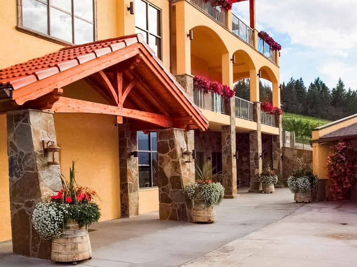 Exterior of Gray Monk Estate Winery in Lake Country, BC, with stone pillars, balconies, and colorful flowers overlooking the vineyards.